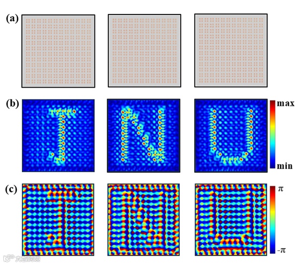 图6.(a)字母型超表面阵列;(b)超表面阵列振幅分布;(c)超表面阵列相位分布