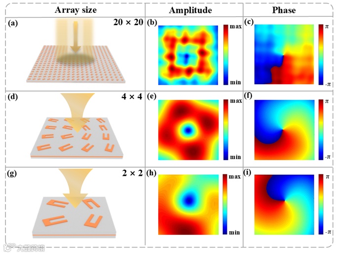 图5.不同阵列尺寸超表面的近场结果。图(a)显示20×20的超表面,图(b)和图(c)显示RCP照明下模拟的近场振幅和相位分布。当阵列尺寸减小为4×4时,图(d)显示阵列的结构,图(e)和图(f)显示相应的模拟近场振幅和相位分布。对于进一步缩小为2 × 2的阵列尺寸,图(g)显示配置,图(h)和图(i)显示模拟的近场振幅和相位分布