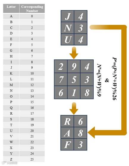在本研究设计的加密方案中,字母和数字之间的映射关系见图9左侧的映射表。此外,设计中使用的九宫格对于不同的密码文本并不是固定不变的,修改九宫格中的任何有效数字都会导致最终结果的变化。例如,在本例中,采用了与前文中不同的九宫格,同时确保其保持对称并遵循经典的数字九宫格结构。然而,当使用这种修改后的九宫格和给定的加密公式对“JNU”进行加密时,得到的密文是“RAF”,而不是之前得到的“UAC”。这表明所提出的加密方案并非完全僵化,而是灵活的,通过调整底层网格参数,可使密文输出发生显著变化。