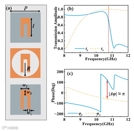 图2. 超表面单元结构示意图:(a) 金属层和介电层的尺寸参数; (b) 模拟单元的透射系数; (c) 模拟单元的传输相位