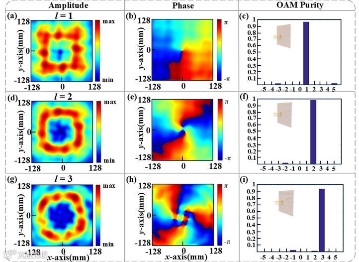 图3.不同拓扑电荷的超表面近场数值模拟结果。图(a)和(b)显示在10.67GHzRCP照明下,拓扑电荷为l=1涡旋光束的模拟近场强度和相位分布;图(c)显示相应的模拟纯度。仅改变拓扑电荷时,图(d)和图(e)为l=2时模拟近场强度和相分布,图(f)为模拟纯度。图(g)和(h)显示l=3时的近场强度和相位分布,图(i)显示相应的模拟纯度