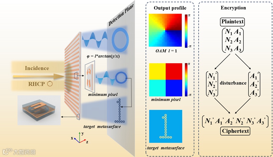 图1. 沿光传播方向产生涡旋光束的透射超表面示意图。超表面采用最小尺寸阵列为目标图像产生涡旋像素点,结合基于权重计算实现字符的多层加密