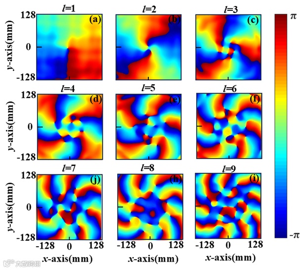 图4.拓扑电荷对应涡旋光束的相位分布。(a)-(i)分别表示拓扑电荷值从1到9的情况