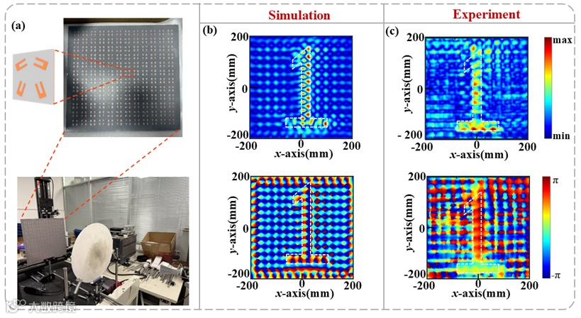 图7.(a)制作超表面板和实验装置,用于测量设计的超表面的近场结果;(b)10.67 GHz的振幅和相位模拟分布;(c) 10.67 GHz时实验测量的振幅和相位分布