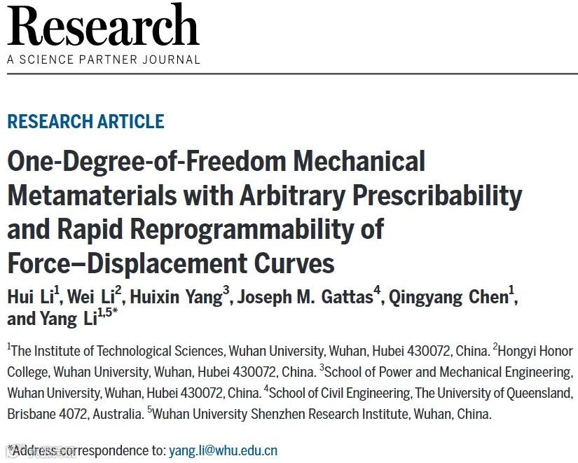 Citation: Li H, Li W, Yang H, et al. One-Degree-of-Freedom Mechanical Metamaterials with Arbitrary Prescribability and Rapid Reprogrammability of Force–Displacement Curves. Research, 2025, 8: 0715.