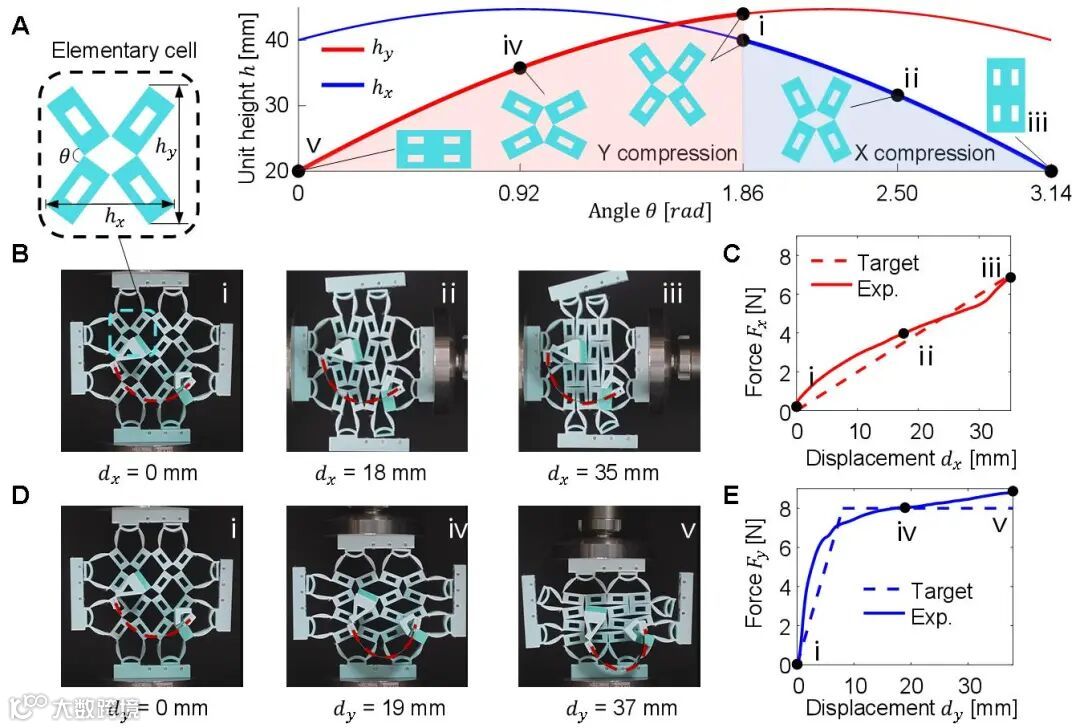 本研究揭示了多自由度机械超材料类似“欠驱动系统”的本质,其变形过程受能量最小原理约束,难以实现任意力学响应。针对这一问题,研究团队提出反设计策略,通过理论、仿真与实验系统验证,实现了硬化/软化位置可调、响应程度可控的各向异性非线性行为。该材料兼具轻量化、大变形与易加工等优点,为智能可重构结构的设计提供了新范式。