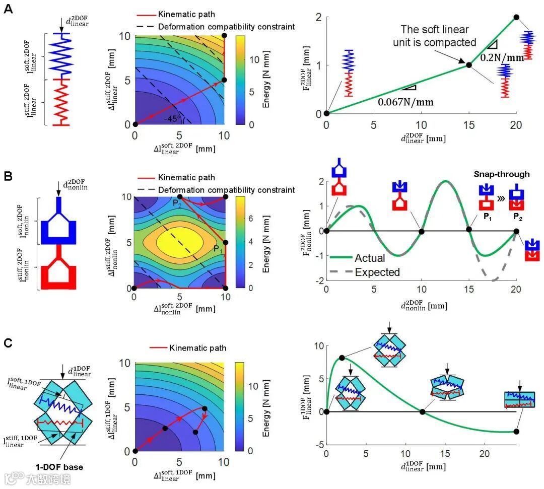 研究团队对比分析了单自由度与多自由度系统在实现可编程力学响应方面的能力。以三种典型结构为例——不同刚度的线性弹簧串联、非线性弹簧串联系统,以及由单自由度机构与弹性元件耦合构成的单自由度系统。结果表明,多自由度系统由于其“欠驱动”特性,变形路径受限于最小能量原则,难以实现复杂的应力-应变关系。而单自由度系统则可精确控制结构的运动路径,突破传统设计限制,具备实现任意非线性力学响应的潜力(图1)。