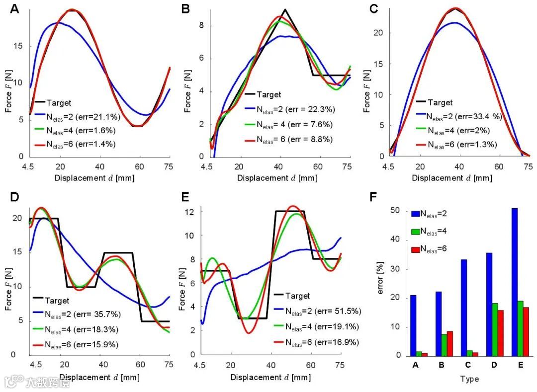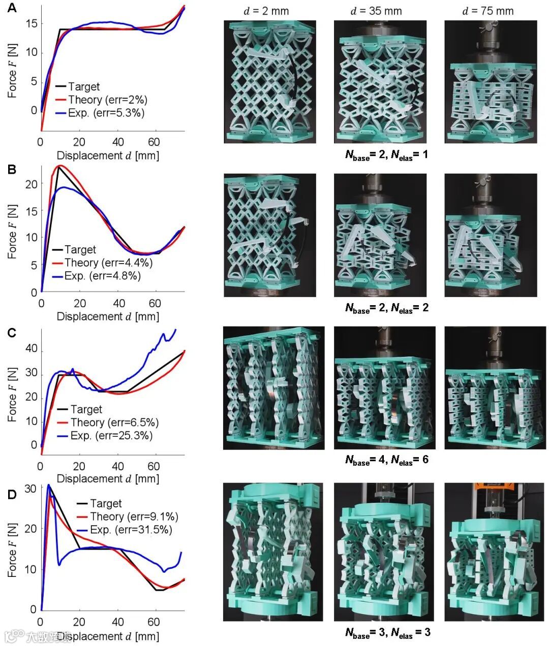每个弹性组件包含两个整数设计变量和六个实数设计变量,通过对其压缩过程中的能量变化进行描述,实现了机械超材料应力-应变曲线的参数化表达。研究团队采用双材料 3D 打印技术制备了四组不同目标曲线的样本,实验结果验证了理论模型的准确性与有效性。此外,团队还系统分析了不同数量弹性组件对同一目标曲线拟合效果的影响(图3和图4)。
