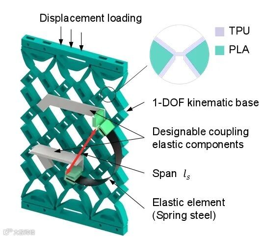 随后,针对上述问题,提出了一种基于弹性组件与运动学基座耦合的机械超材料新范式。本文采用单自由度运动学框架与弹性组件相结合,有效消除了多自由度系统中能量梯度对变形路径的影响(图2)。