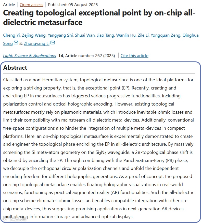 研究成果以《Creating topological exceptional point by on-chip all-dielectric metasurface》为题发表于《Light: Science & Applications》。武汉大学Cheng Yi、Zejing Wang为论文共同第一作者;武汉大学Zhongyang Li和清华大学深圳国际研究生院Qinghua Song为论文共同通讯作者。