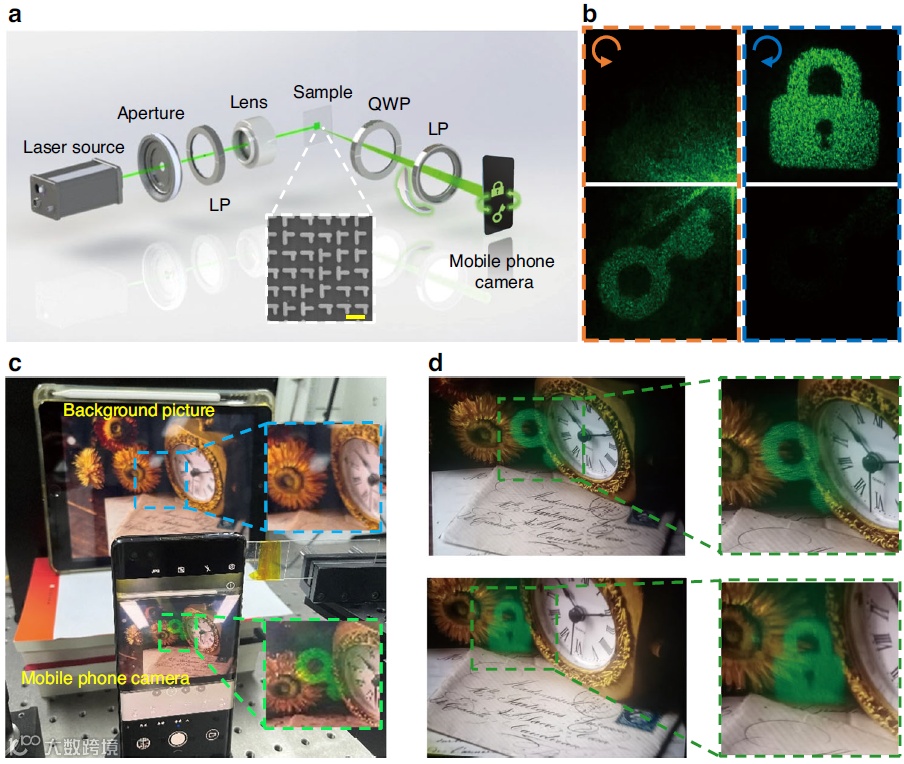 实现的效果:成功解耦左旋(LCP)和右旋(RCP)圆偏振通道,实现 “Key” 和 “Lock” 等独立全息成像;全息图像可悬浮于现实场景,具备增强现实(AR)功能,无零级衍射干扰,清晰度高,兼容集成光子平台。