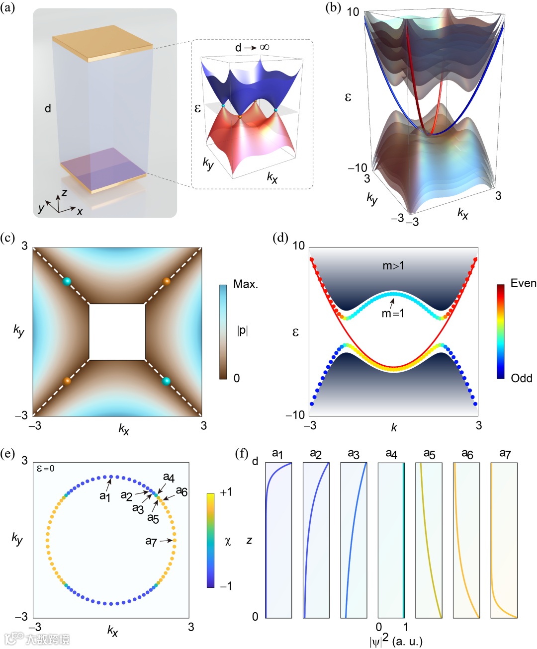 图1 外尔超材料波导中手性拓展态理论模型分析。(a) 外尔波导示意图。(b) 体模式的能带结构。(c) 衰减常数p在动量空间中的分布。(d) 本征模式沿kx=ky的对称性。(e) 二维等频轮廓和本征模式的不对称分布。(f) 态密度分布。