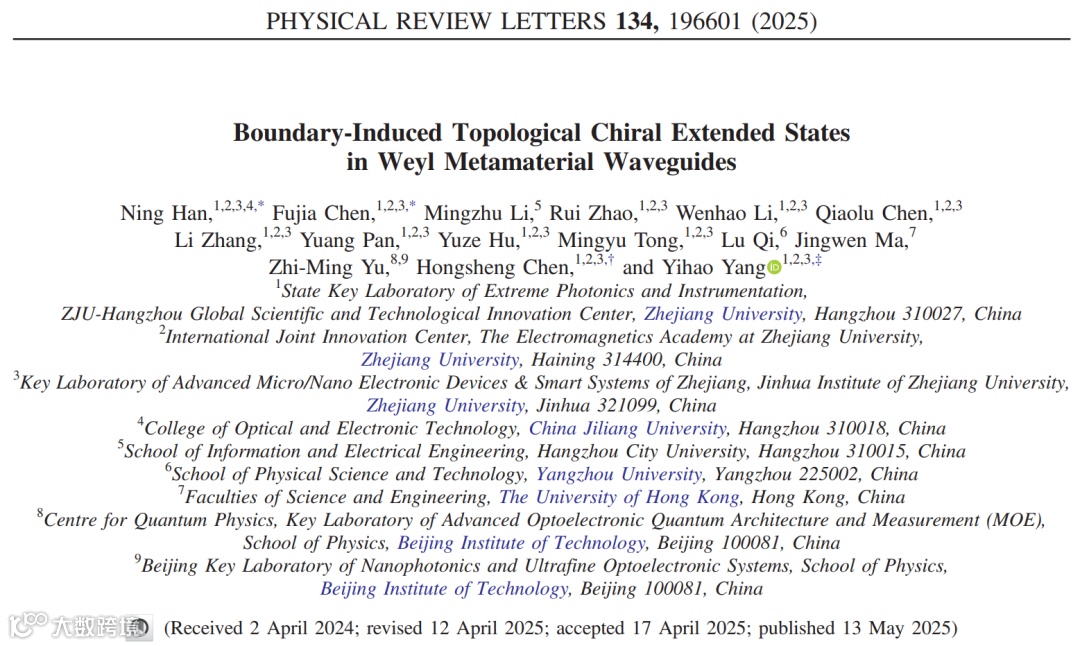 近日,浙江大学杨怡豪研究员、陈红胜教授课题组提出并实验证明了外尔超材料波导中边界效应诱导的手性拓展态。不同于传统手性体态,该模式的发现标志着诱导手性体态的新机制,揭示了边界能够调节外尔准粒子的新自由度,在高功率拓扑器件方面展现出重要的应用前景。相关成果以“Boundary-Induced Topological Chiral Extended States in Weyl Metamaterial Waveguides”为题发表在国际物理学顶级期刊《Physical Review Letters》上。浙江大学博士后韩凝(现为中国计量大学特聘副研究员,研究生导师)为该论文的第一作者,浙江大学博士后陈福家为共同第一作者,浙江大学杨怡豪研究员与陈红胜教授为论文共同通讯作者。
