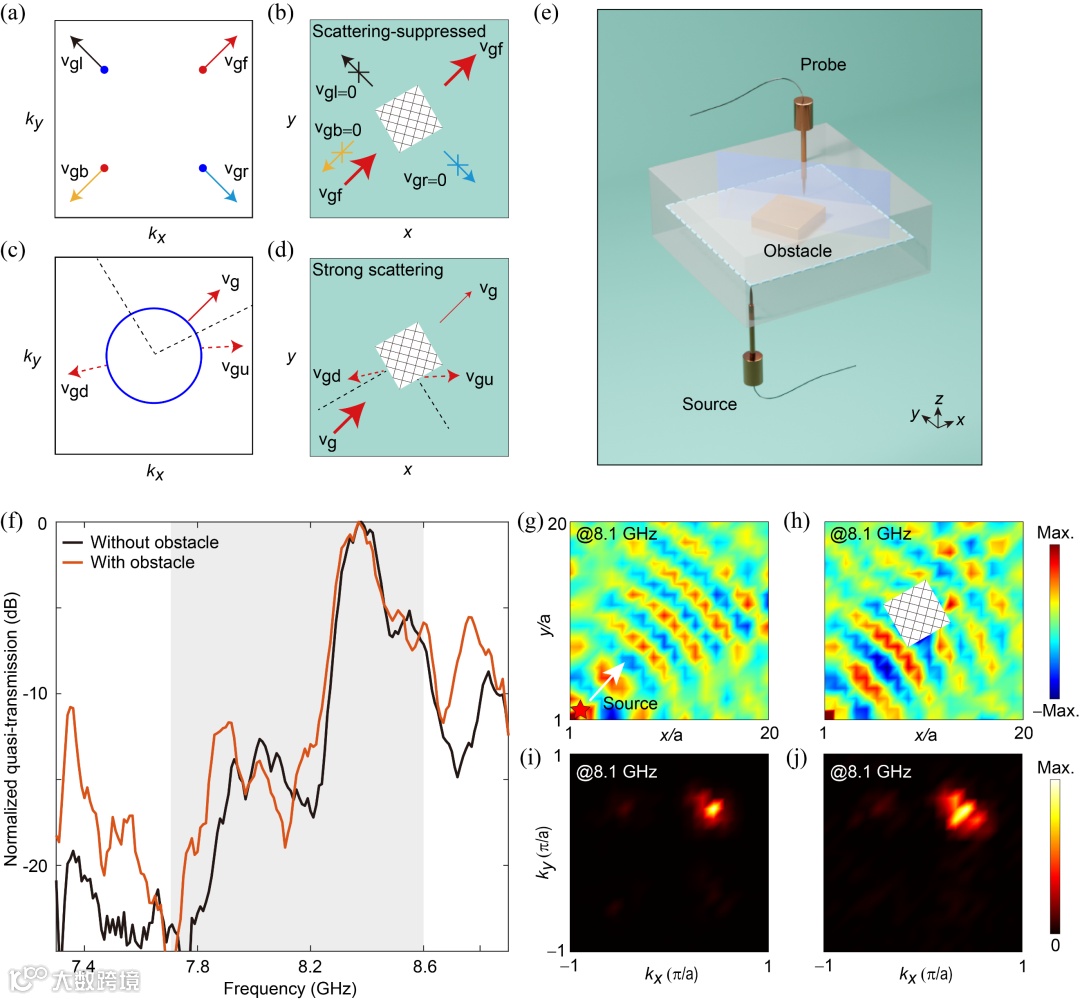 图4 手性拓展态的散射抑制传输。(a)-(d) 传统体态与手性拓展态散射过程示意图。(e) 实验装置。(f) 测量的准传输谱。(g)-(j) 手性拓展态的分布。
