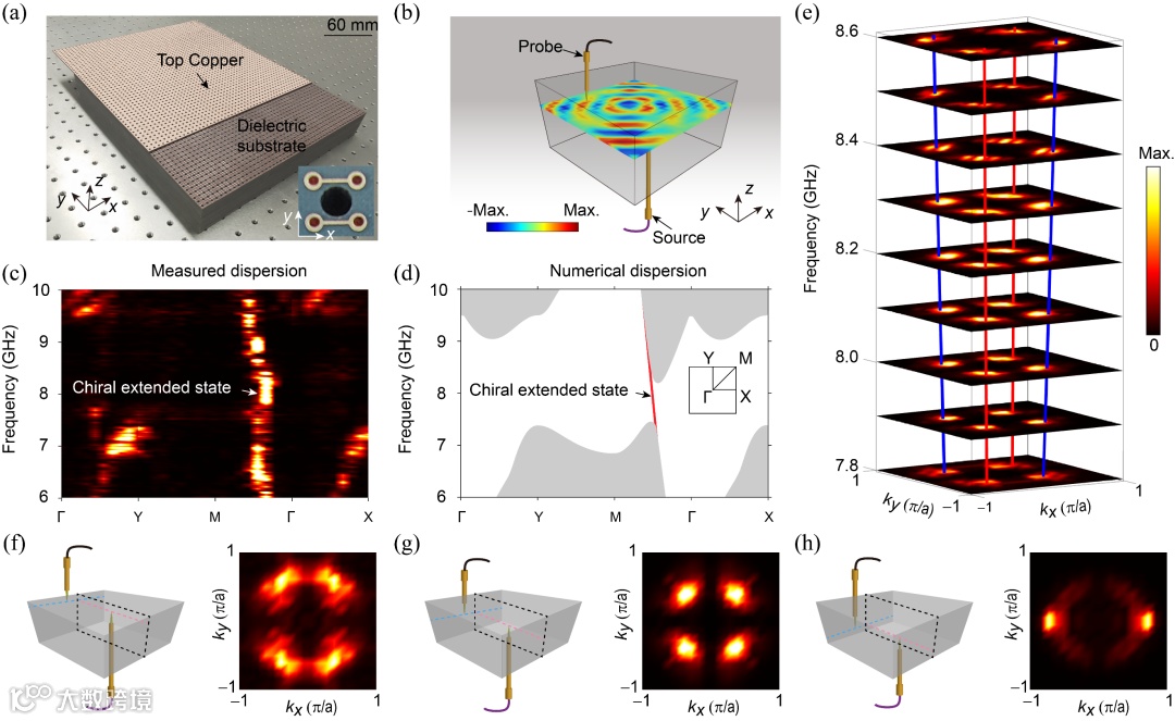 图3 手性拓展态的实验验证。(a) 外尔波导的实验样品。(b) 测量手性拓展态的实验设置。(c), (d) 手性拓展态的实验测量与数值仿真。(e) 实验测量不同频率下手性拓展态的二维等频轮廓。(f)-(h) 8.1GHz下测量的顶部费米弧表面态、手性拓展态及底部费米弧表面态的二维等频轮廓。
