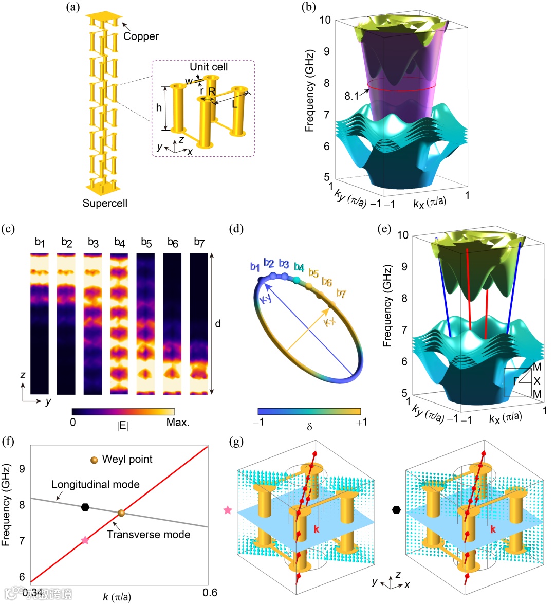 图2 第一性原理研究。(a) 外尔超材料波导的超晶胞结构。(b) 外尔波导的能带结构。(c) 本征电场模式分布。(d) 本征模式非对称分布的二维等频轮廓。(e) 手性拓展态的色散。(f) 外尔点附近的横模与纵模。(g) 横模与纵模的本征场。
