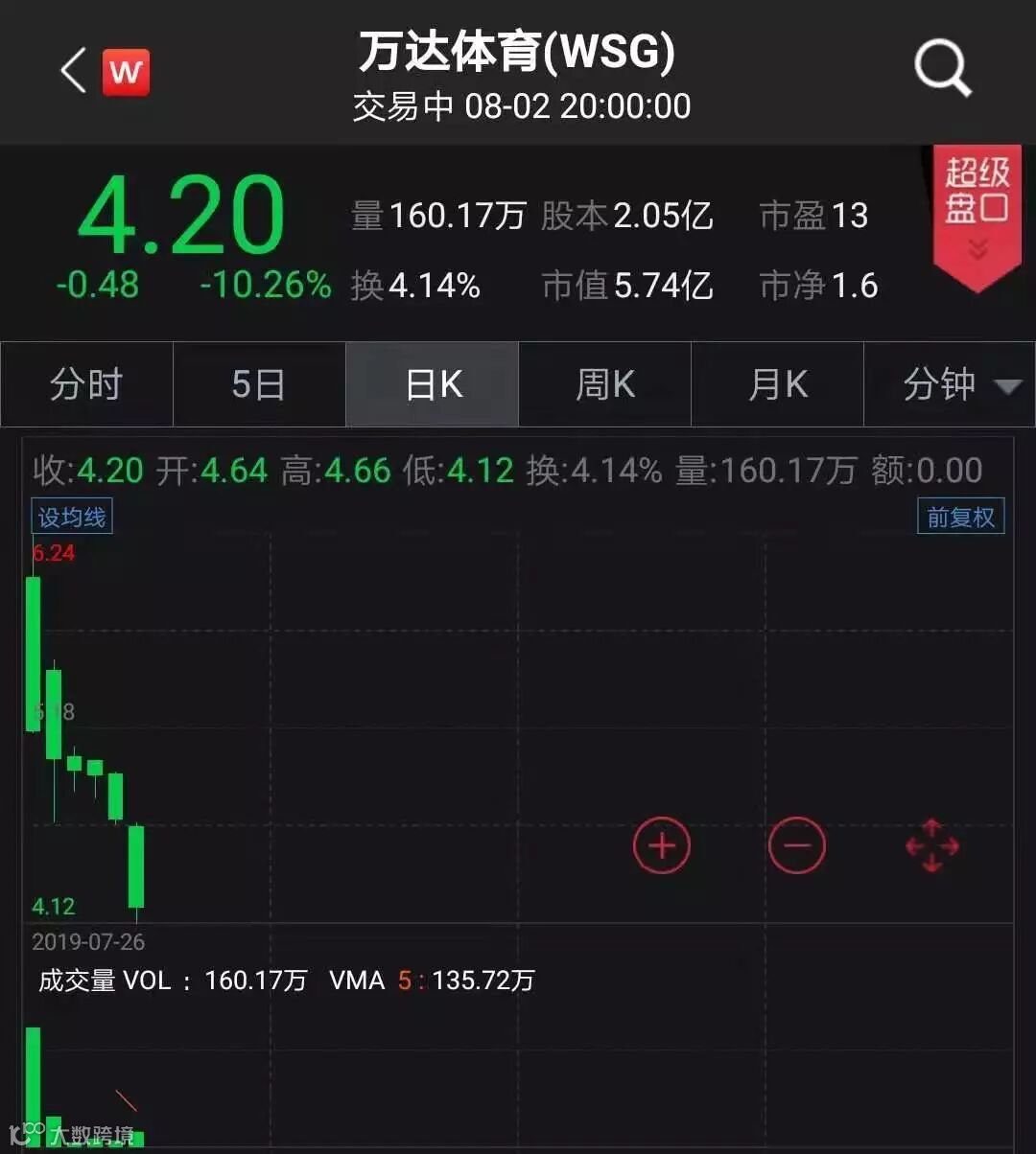 中概股涨跌互现 万达体育上市六日股价近乎腰斩