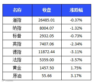 美三大股指上周五下跌。截至收盘,道琼斯工业平均指数下跌98.41点,报26485.01点,跌幅0.37%。标准普尔500种股票指数下跌21.51点,报2932.05点,跌幅0.73%。纳斯达克综合指数下跌107.05点,报8004.07点,跌幅1.32%。在上周的整体交易中,标普500指数和纳指分别累跌3.1%和3.9%,均创2019年以来最大单周跌幅;道指累跌2.6%,创下年内第二大单周跌幅。