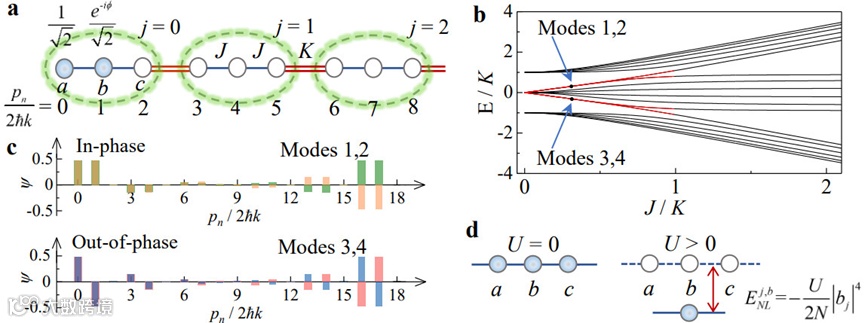 图1. (a) 超冷铯原子的三聚体动量晶格示意图,(b) 无相互作用下的能谱, (c) 三聚体拓扑晶格的4种本征模式,其对应于(b)中黑色点,(d) 动量晶格中原子相互作用引起的非线性能量偏移。