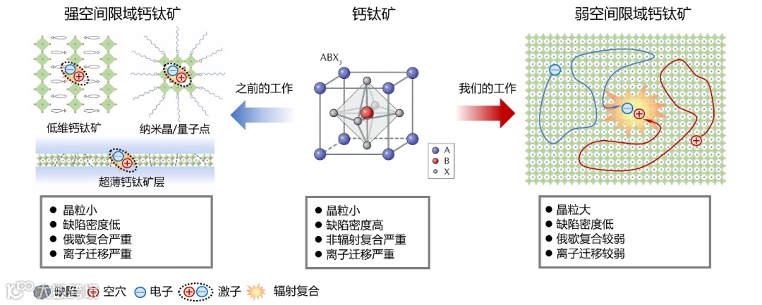 钙钛矿是一种性能优越的新型材料,具有高发光效率、成本低廉和制作灵活的优点,在太阳能电池、LED和探测器中应用前景广泛。然而,由于传统的钙钛矿材料中,电子和空穴(负责发光的电荷)难以有效碰撞发光,因此科研人员之前多采用“强空间限域”的方法——例如制作非常小的纳米颗粒或极薄的材料层,来提高发光效率。但这种方法的缺点是LED很难达到高亮度,而且使用寿命短,通常只能持续工作数小时,很难应用在实际生活中的产品中。
