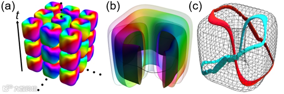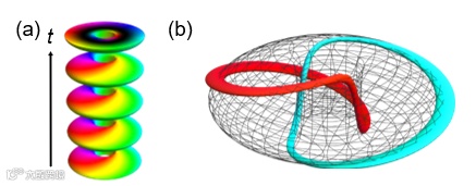 图1:霍普夫子的概略图。霍普夫子由(a)环面嵌套结构构成,每个环面由(b)具有固定交叉次数的环路集合组成。每个环路呈现(c)特定方向的空间分布的向量。
