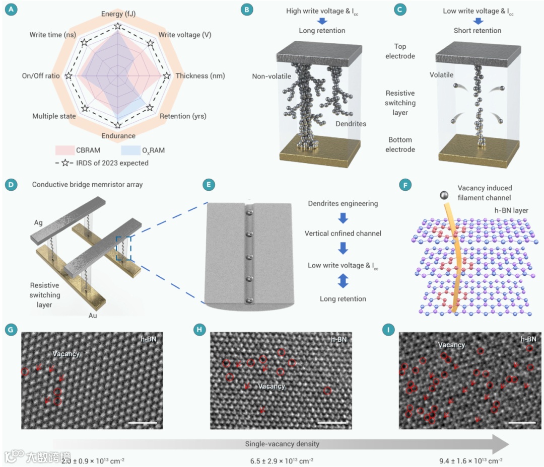 图2 可调控缺陷密度的单晶h-BN及其忆阻器应用原理 (A)国际器件与系统路线图(IRDS)预测的两种忆阻器(阻变存储器RRAM)性能;(B-C)揭示忆阻器"功耗-保持困境"的本质;新型导电桥忆阻器阵列(D)设计应通过预定义纳米通道(E)引导银离子(Ag⁺)定向迁移,抑制导电枝晶的无序扩展。(F)单晶h-BN中垂直排列的缺陷路径使银原子沿电极间最短距离传输;(G-I)高分辨透射电镜直接观测到单晶h-BN中单空位缺陷密度(nSV)的可控变化。
