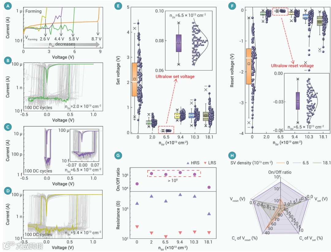 图3 不同单空位密度的h-BN忆阻器阻变特性 (A)单空位密度(nSV)调控显著影响器件形成导电路径的过程;(B-D)100次连续I-V循环显示器件的高重复性,不同nSV的h-BN均展现非易失双极阻变特性;(E-F)器件运行电压统计分析表明:运行电压与功能层中的单空位缺陷密度有关(G)器件开关比与SV密度关系;(H)不同缺陷密度h-BN综合性能对比。