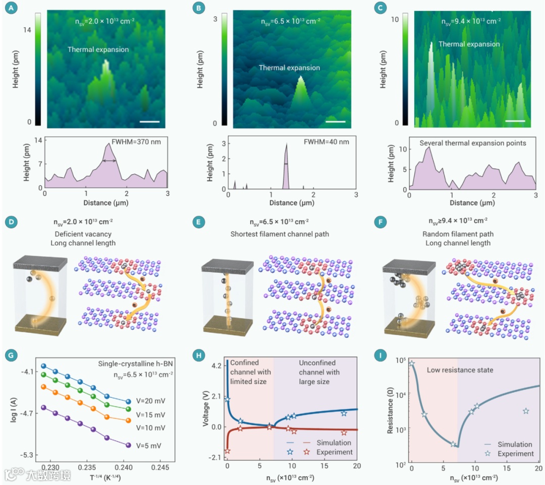 图4 单晶h-BN导电枝晶工程实验与理论验证 (A-C)扫描焦耳膨胀显微镜(SJEM)直接观察导电通道;(D-F)缺陷密度调控导电路径的示意图;(G)温度变化试验证明特定缺陷密度下银离子跃迁传导机制;(H-I)银离子跃迁导电机制模型与实验数据拟合。