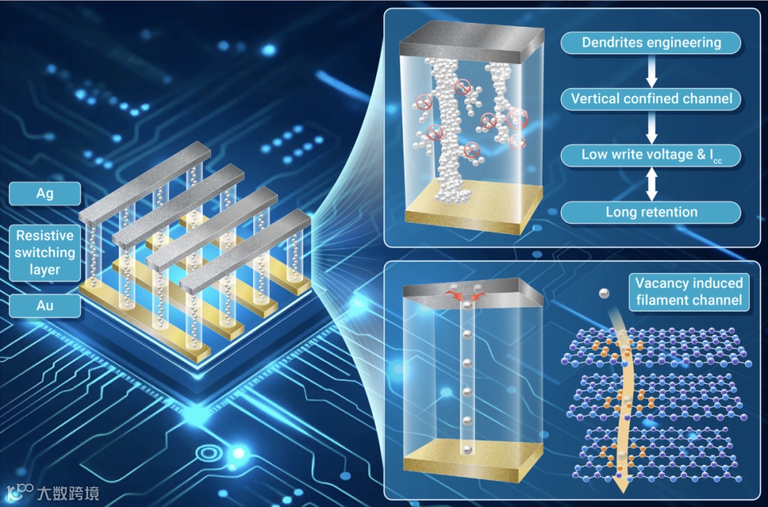 作为存储和计算器件的核心组成元件,传统忆阻器在工作时总在“省电”与“记性差”间挣扎,如何在忆阻器的纳米世界中寻求稳定的最短路径?研究团队化身原子工匠,在单晶h-BN中“雕”出垂直纳米通道,通过约束导电枝晶生长,引导银原子沿垂直通道在上下电极之间架起银丝桥,在量子尺度筑起牢不可破的"记忆城堡",让“省电”与“十年不忘”共存,为未来AI芯片的发展按下加速键。