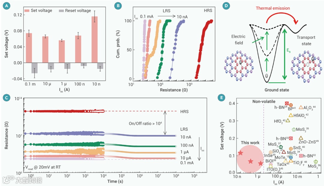 图3系统研究了不同单空位缺陷(SV)密度的h-BN对忆阻器性能的影响。测试结果表明(图3A-D),单空位缺陷密度与运行电压的关系呈现“U型”趋势(图3E-F),在缺陷密度为6.5×1013 cm-2下,忆阻器获得最低设定/复位电压(73 mV/-14 mV),开关电阻比高达108(图3G),