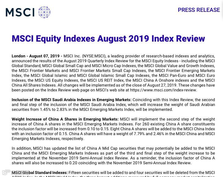 刚刚,MSCI宣布A股第二步扩容计划:260只现有的中国大盘股纳入因子将从10%提升至15%,此外8只中国A股将被以15%的纳入因子加入。