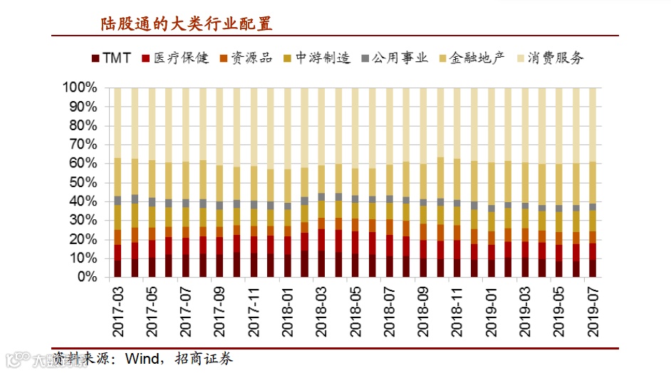 大类行业的配置方面,陆股通持股中,TMT、中游制造占比继续上升,医疗保健、公用事业占比略有回升,资源品、消费服务占比继续较大比例下降,金融地产占比有所回落。具体地,7月末TMT和中游制造行业持股占比分别为9.4%和11.3%,分别较前期提升0.60%和0.53%;医疗保健、公用事业持股占比分别为8.8%和3.3%,分别较前期上升0.01%和0.06%;资源品和消费服务持股占比分别为6.1%和39.0%,分别较前期下降0.40%和0.58%;金融地产持股占比从前期的22.3%回落至22.1%。
