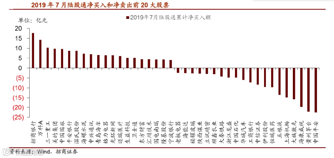 7月沪指在2900点至3000点一线反复震荡盘整,北向资金维持小幅净流入态势。东方财富网数据显示,7月北向资金合计净流入120.25亿元,为连续第2个月净流入。今年前7个月,北向资金合计净流入逾千亿元。尽管北向资金前20大持仓中茅台等消费蓝筹仍是重仓股,但是从7月净买入卖出来看,茅台位列净卖出的前列,抱团消费蓝筹的趋势松动。从行业来看,也显示了亲TMT,中游制造、医疗保健的趋势。