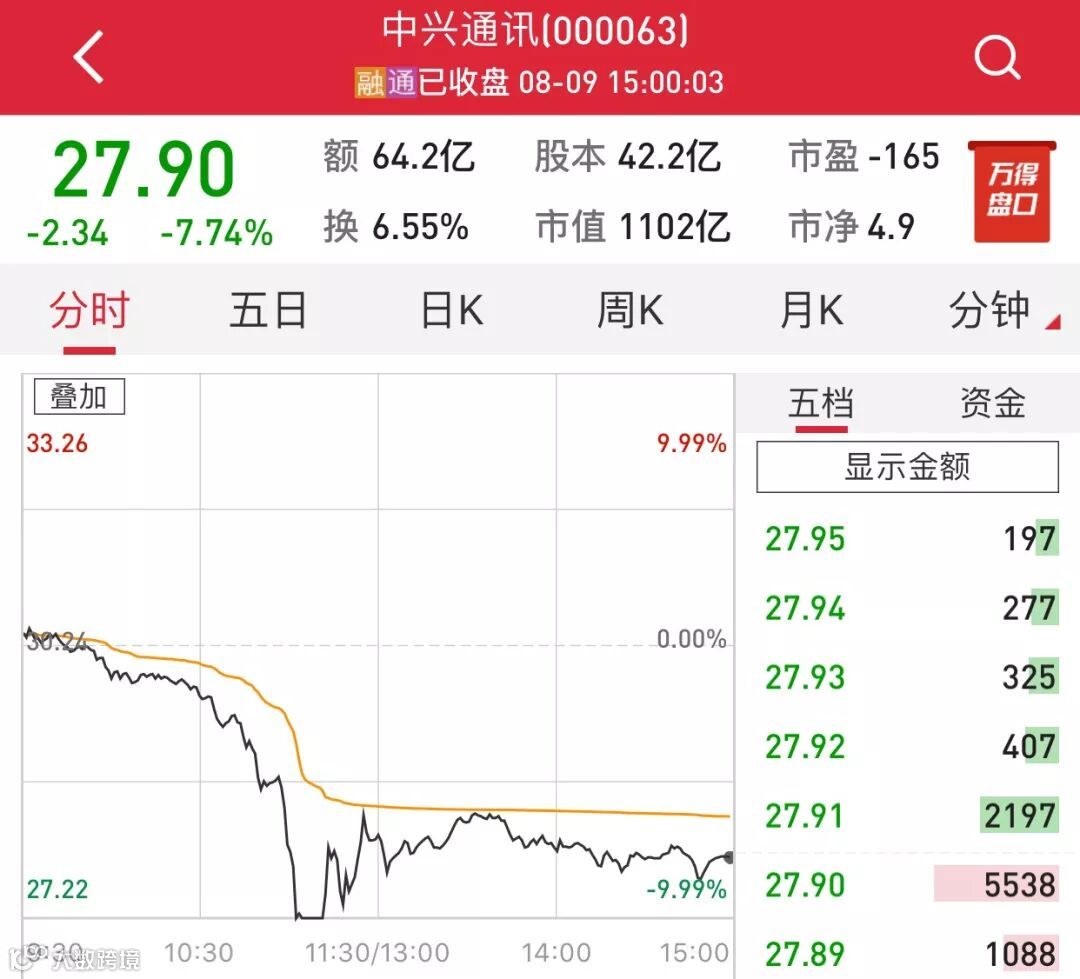 中兴通讯一度跌停