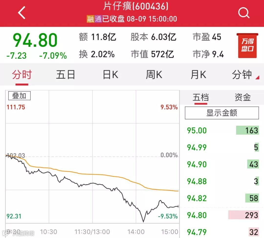 截至8月9日股市收盘,片仔癀收盘报价94.80元,跌幅达7.09%,成交额达11.85亿元。