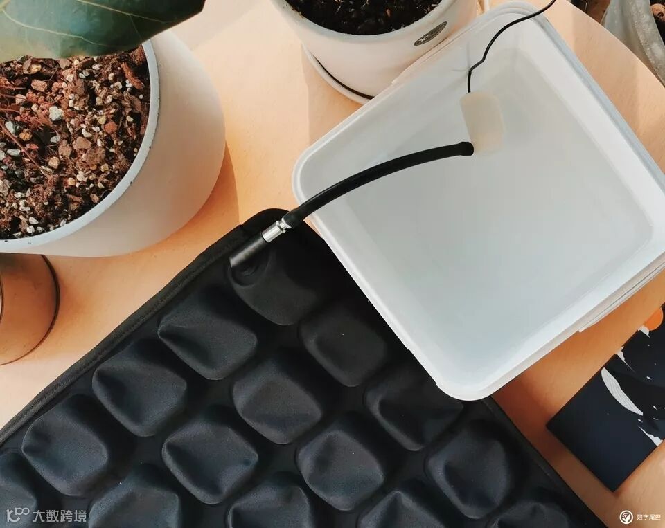 买充水款时会附带一个水泵。先需要接一盆水4L 左右足够,然后把微型水泵的管子接好。