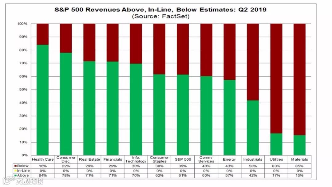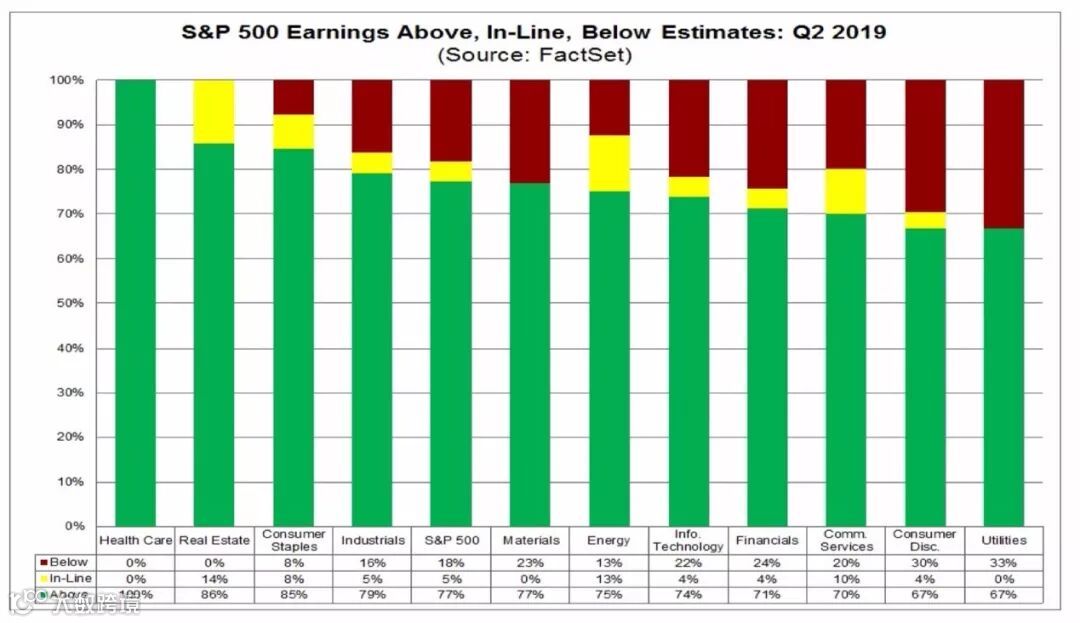 从已经披露二季度财报的公司的实际业绩和预期对比状况来看,医疗保健行业表现较好;原材料行业、公用事业表现较差。医疗保健行业盈利全部超过预期,营收超预期的个股比例也最多;公用事业领域盈利状况不及预期的比例最大,原材料业和公用事业营收状况不及预期的比例最大。