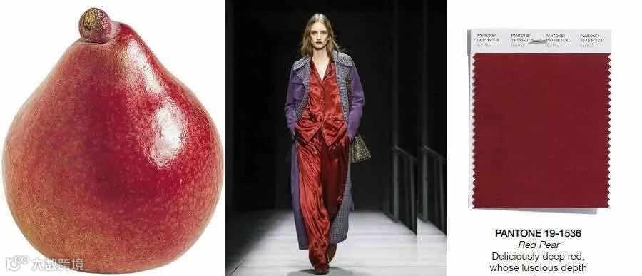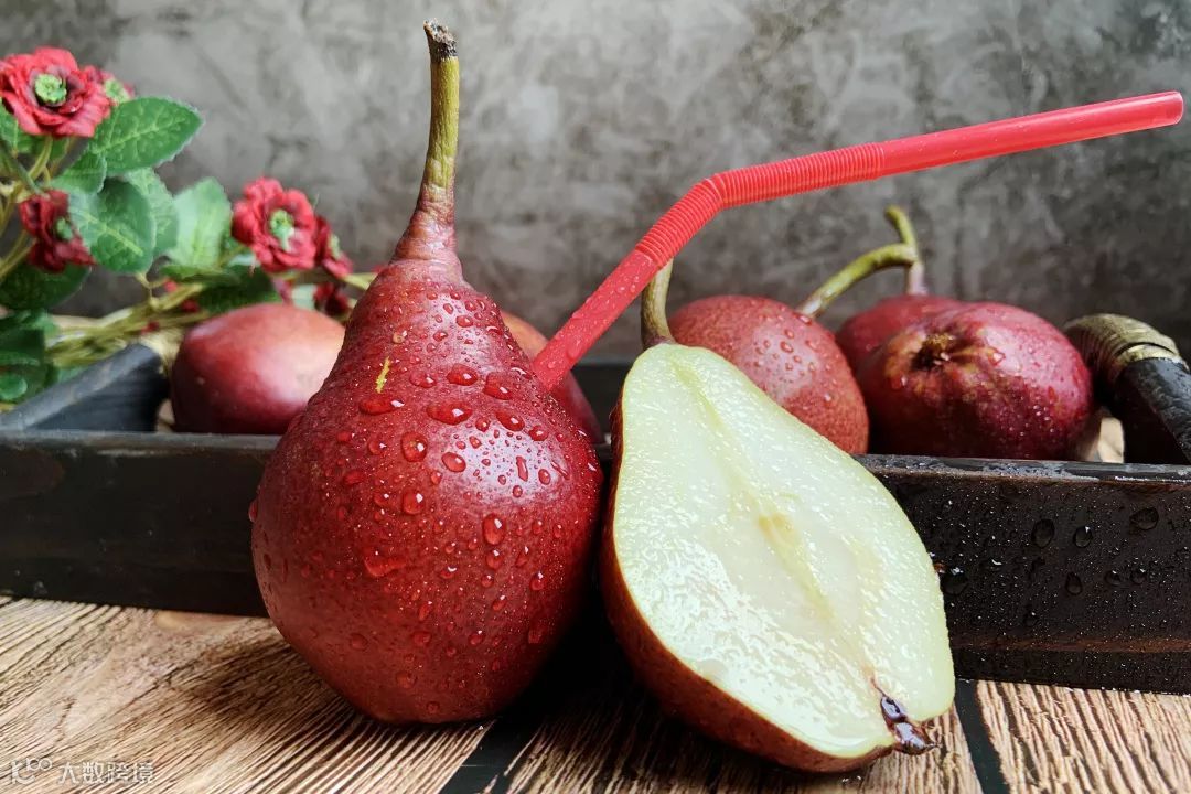 与市面上的青梨不一样,它的果皮比苹果还要红,偏暖的酒红色,就像羞红的小脸蛋一样,也造就了火爆时尚圈的流行色——红梨色!