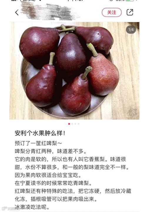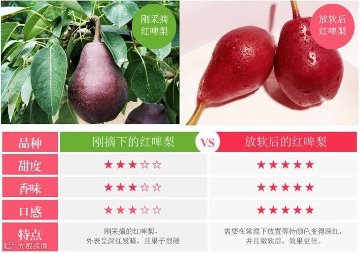 新鲜采摘的红啤梨,一般是7-8分熟,收到时是硬的,吃起来口感会较酸涩。建议可以和苹果香蕉一起放几天,等外皮变为玫红色,果肉会像奇异果那样甜软,甜度爆表!