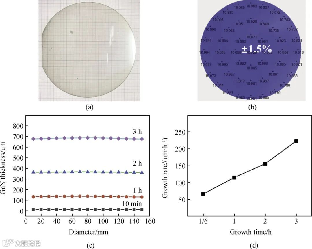 图4 HVPE外延6英寸GaN单晶厚膜光学照片、厚度不均匀性及生长速率变化曲线。10 min下获得GaN厚膜的光学照片(a)及厚度分布mapping图(b);不同生长时间下GaN厚度沿直径方向分布图(c)及生长速率随生长时间变化曲线(d)