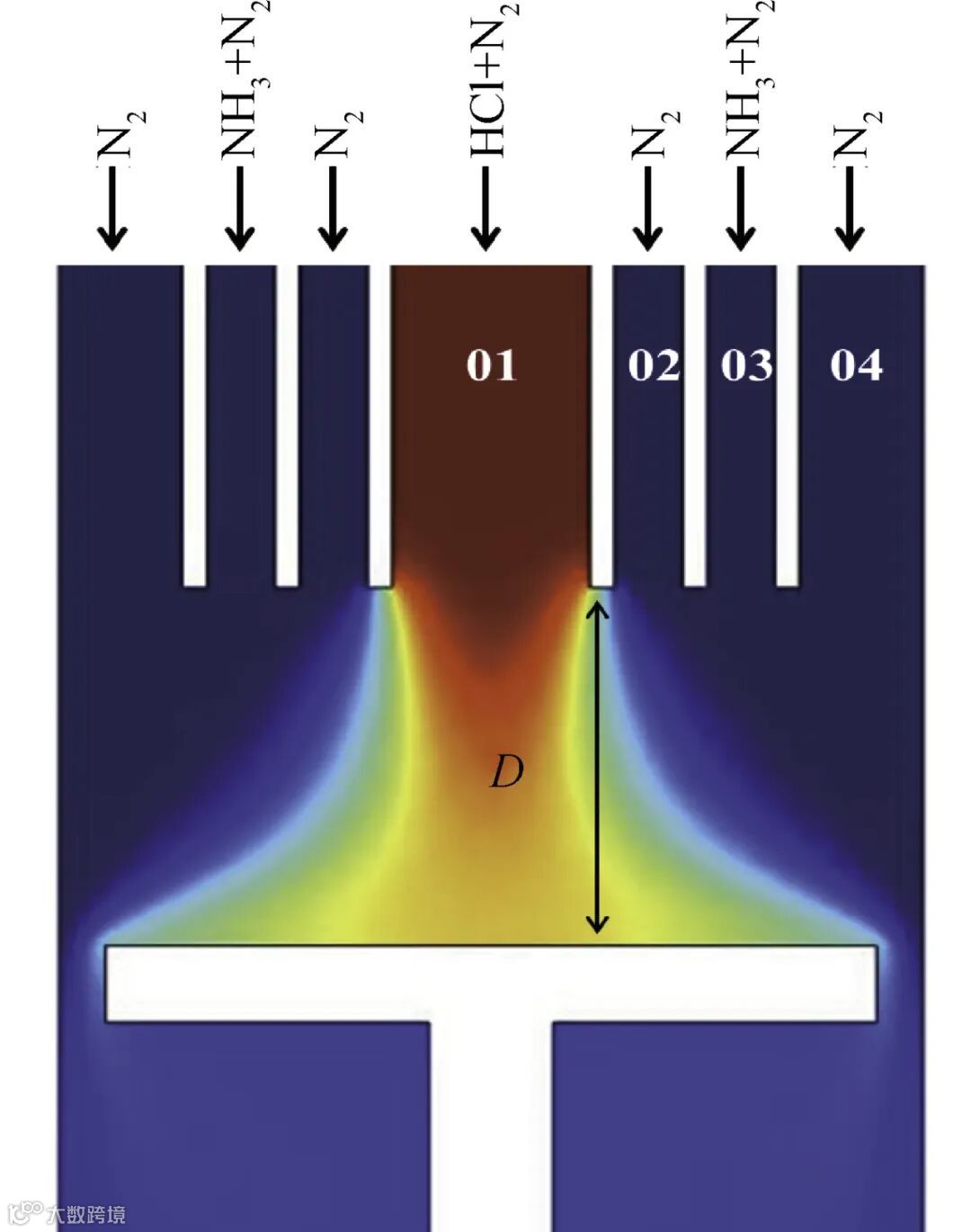 图1为6英寸立式HVPE反应腔室结构示意图,进气端口由HCl气路(01路)、分隔气体气路(02路)、NH3气路(03路)和总氮气气路(04路)组成。