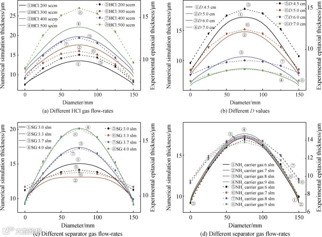 图2 不同条件下数值模拟(实线)与外延实验(虚线)中GaN膜厚度(生长速率)沿直径方向上的变化图谱