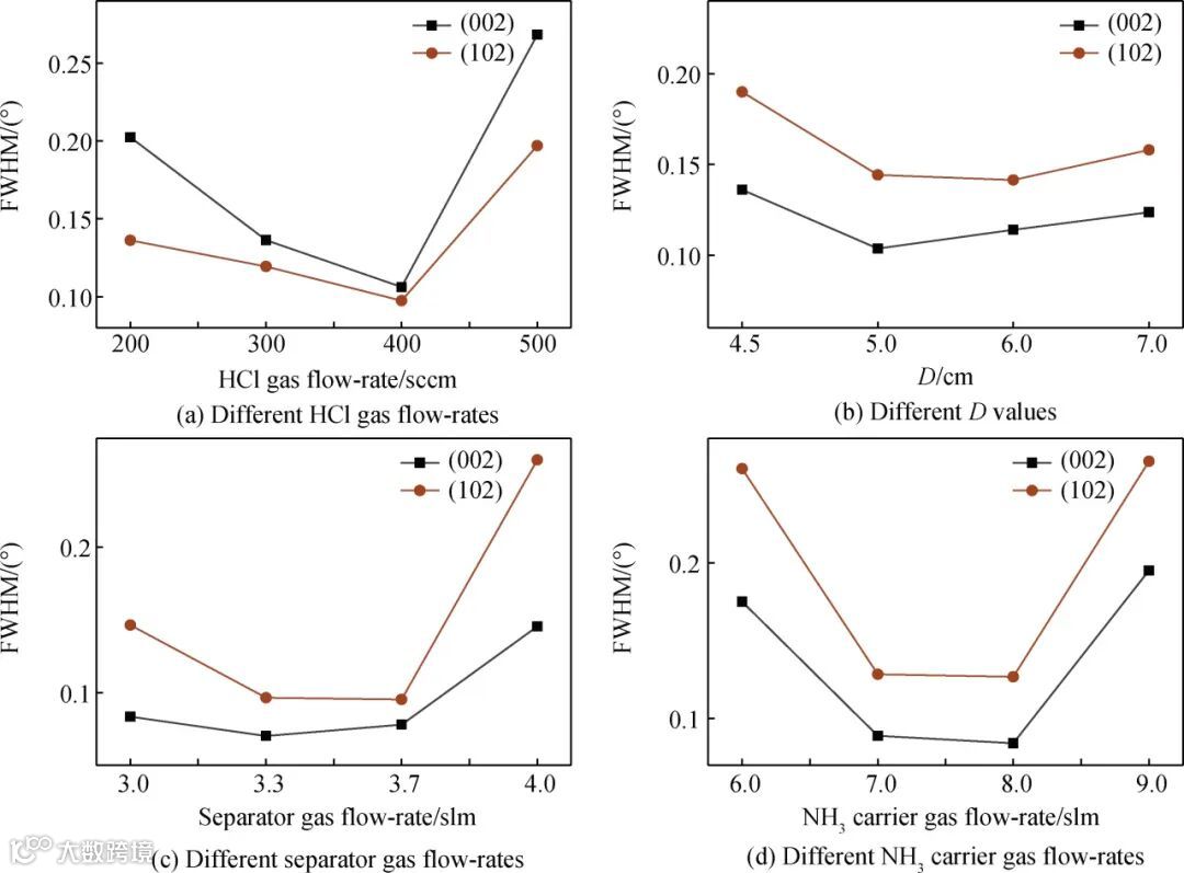 对不同条件下生长的6英寸GaN薄膜进行晶体质量表征,其摇摆曲线半峰全宽变化趋势如图3所示。当分隔气体流量在3~3.5 slm、HCl气体流量在300~400 sccm、D值在5.0 cm左右时,薄膜具有较高的晶体质量,同时生长速率为90 μm/h。外延时间3 h时,6英寸GaN薄膜的平均生长速率达200 μm/h。