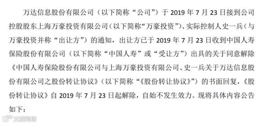 7月23日,万达信息发布公告称,中国人寿同意解除此前与公司控股股东万豪投资、实际控制人史一兵签署的《股份转让协议》。