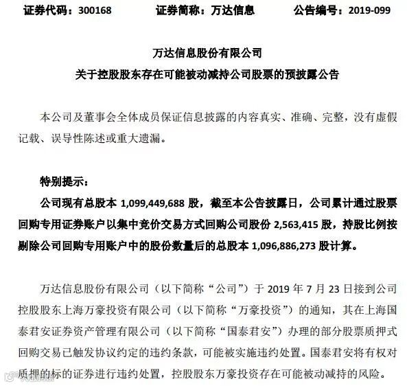 值得注意的是,万达信息23日晚同时公告,控股股东万豪投资在国泰君安办理的部分股票质押式回购交易已触发协议约定的违约条款,可能被实施违约处置。国泰君安将有权对质押的标的证券进行违约处置,控股股东万豪投资存在可能被动减持的风险。