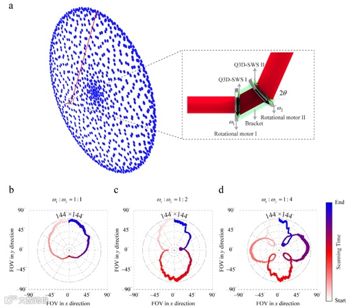研究团队利用磁控溅射、电子束光刻、反应离子刻蚀等技术进行了准三维亚波长结构的制备,通过光谱表征,异常折射效率最高可达93%。在此基础上,研究团队进一步提出了级联准三维亚波长结构非同轴光束扫描系统,如图2所示。通过独立旋转两个级联的准三维亚波长结构,实验展示了半空间光束扫描,实现了144°×144°的视场,最大效率超过86%。通过降低旋转速率比,可以提高扫描轨迹密度,提升分辨率。