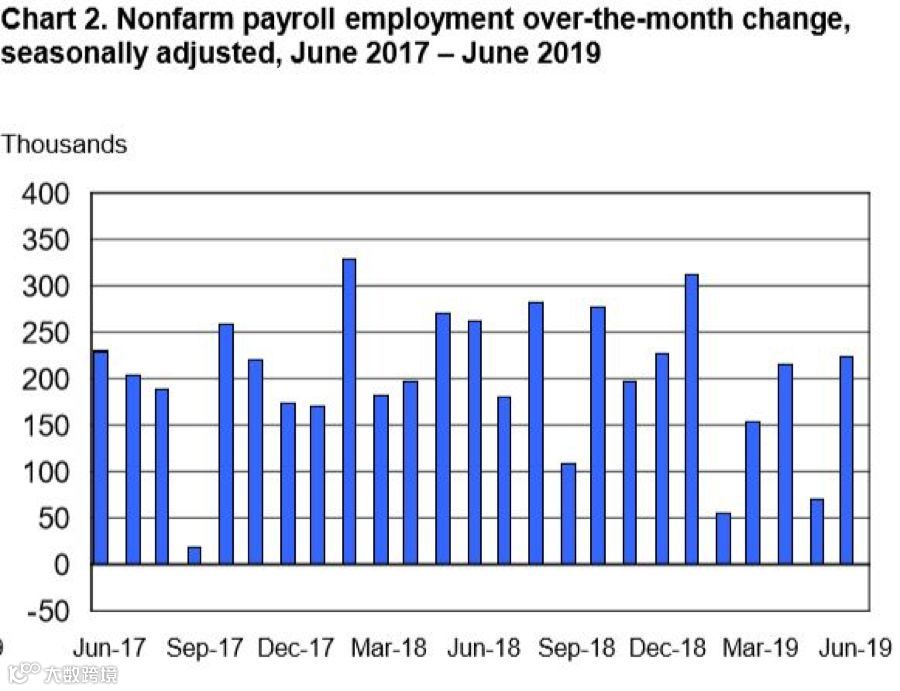 美国劳工部7月5日发布的报告显示,6月非农就业人数增加22.4万,失业率从此前的50年低点3.6%升到3.7%。此前,经济学家预期为就业人数增加16万,失业率为3.6%。