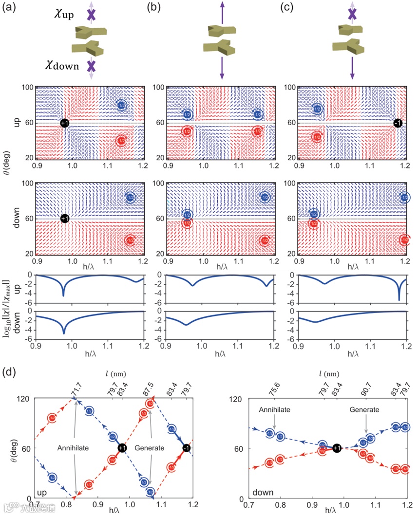 ±1/2)涡度,在这些点上非线性响应完全为对应的圆极化光,表现出手性特性。V点则同样具有左旋(LH)或右旋(RH)的手性但有着整数涡度(±1),在这些点上非线性响应完全消失。这些拓扑奇点的命名来自于光子晶体倒易空间中具有相似性质的同名偏振奇点。研究发现,一般来说,参数空间中有着两对具有相反手性的C点,并且相对于高对称线(θ=60°)镜像分布。通过改变单层元原子的几何参数(如臂长)可以令具有相反手性和相同半整数涡度(v=±1/2)的C点合并形成具有整数涡度(v=±1)的V点。因为双层超表面不具有z方向的对称性,当V点被实现在某一方向上的参数空间中时,可实现SHG的单向发射,而另一方向完全被抑制。而当V点被同时实现在向上和向下发射的参数空间中的同一点时,该点即为一个SHG发射被完全抑制的暗态。