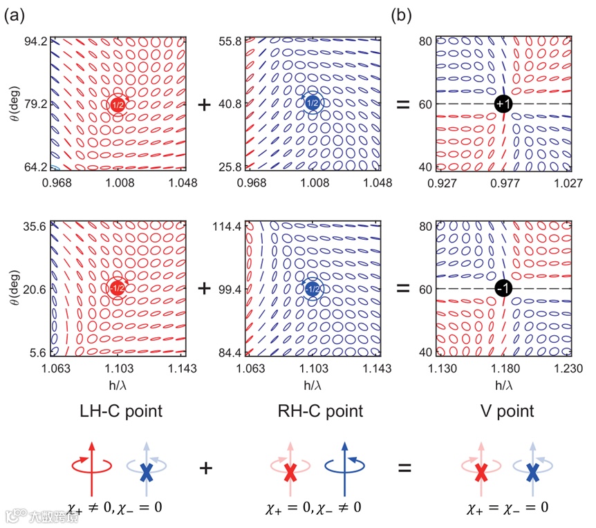 )写成一伪自旋形式,并将其以类似于偏振椭圆的画法表示在h-θ参数空间里,可以发现二阶非线性系数的手性奇点(C点)与旋涡奇点(V点)在参数空间中生成。这些拓扑奇点可以通过手性(handedness)和涡度(vorticity)来标记。