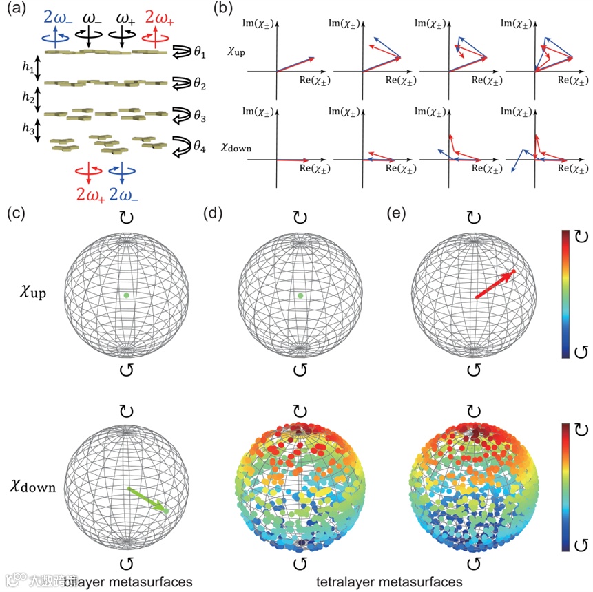 相比双层结构,多层(如四层)转角超表面通过增加层数进一步扩展了调控自由度。这种多层结构允许研究者在不改变元原子几何设计的前提下,仅通过层间参数实现非线性光学调控。四层超表面中,各层的扭转角度(θ1, θ2, θ3, θ4)和层间间隙(h1, h2, h3)共提供六个自由度(因为入射偏振态的任意性,不失一般性地,我们将θ1恒取为0)。这使得研究者能够对SHG的上下发射方向及其偏振态进行独立调控。